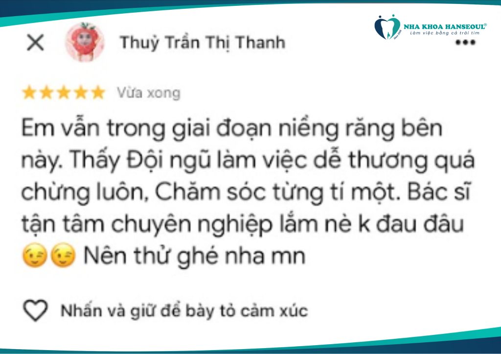 “Đội ngũ làm việc dễ thương quá chừng luôn, chăm sóc từng tí một. Bác sĩ tận tâm, chuyên nghiệp lắm nè, không đau đâu. Nên thử ghé nha mọi người!”
