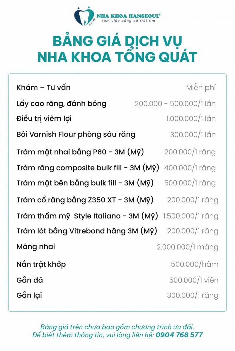 - Chi phí rõ ràng, không phát sinh: Hanseoul niêm yết bảng giá nha khoa tổng quát, báo giá trước điều trị, minh bạch từng hạng mục.