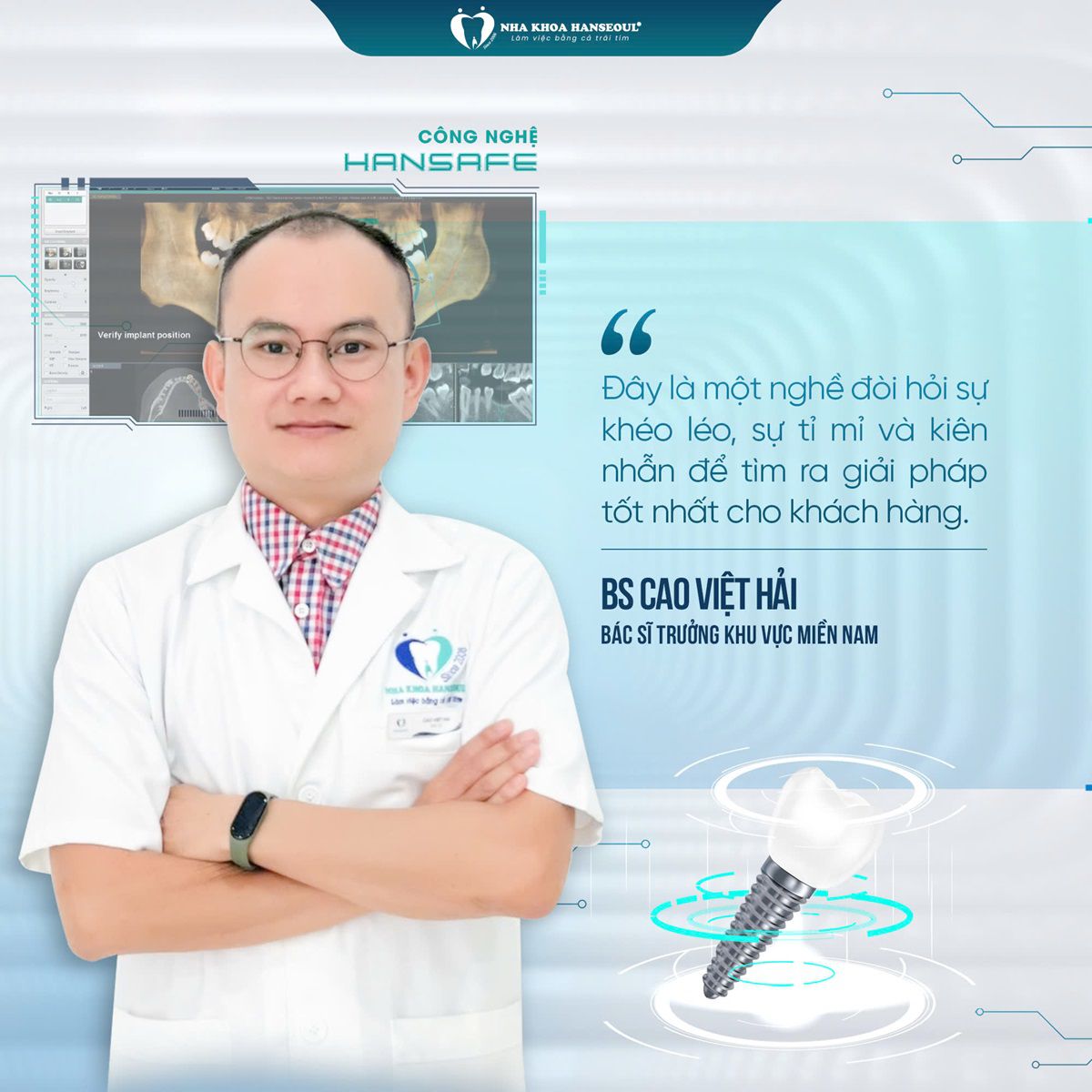 Tại Hệ thống Nha Khoa Quốc Tế HanSeoul, bác sĩ Cao Việt Hải đảm nhiệm vai trò chuyên gia Implant và chỉnh nha, trực tiếp phụ trách:- Cấy ghép Implant phục hồi răng mất, tái tạo chức năng ăn nhai và thẩm mỹ.