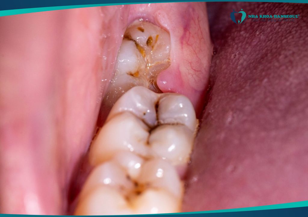 Răng khôn chỉ mọc một phần (mọc kẹt), mô nướu phủ bên trên dễ bị vi khuẩn tấn công, gây: