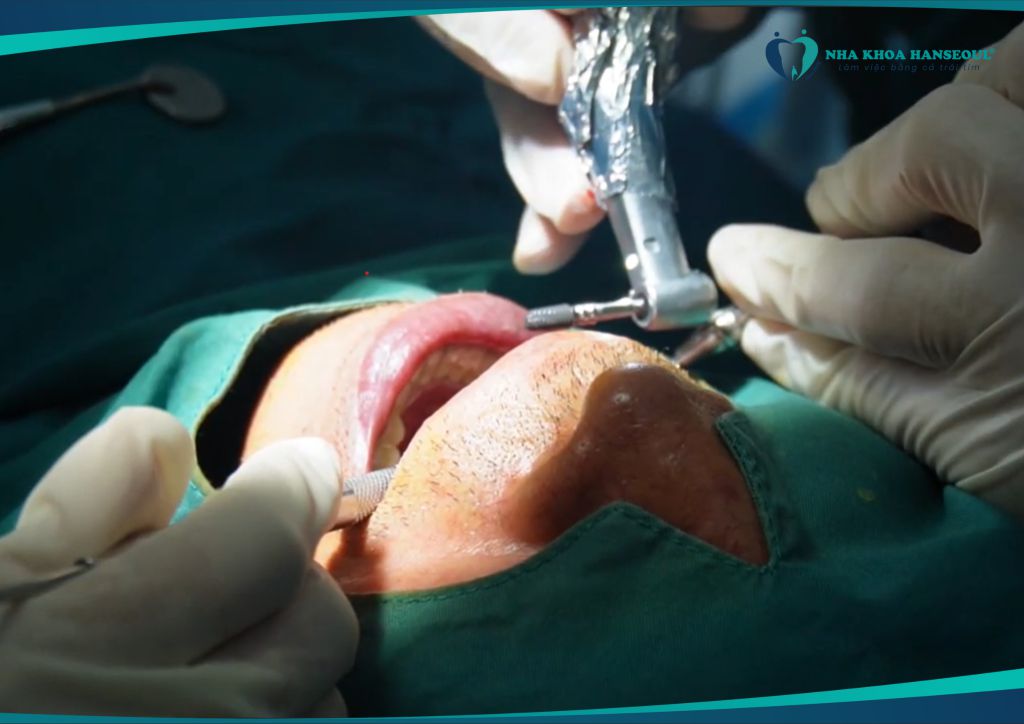 - Tiểu phẫu đặt trụ: Bác sĩ sẽ khoan một lỗ nhỏ trong xương hàm và đặt trụ Titanium vào.